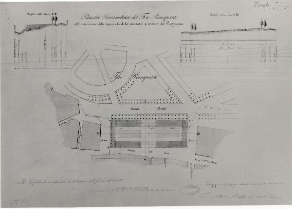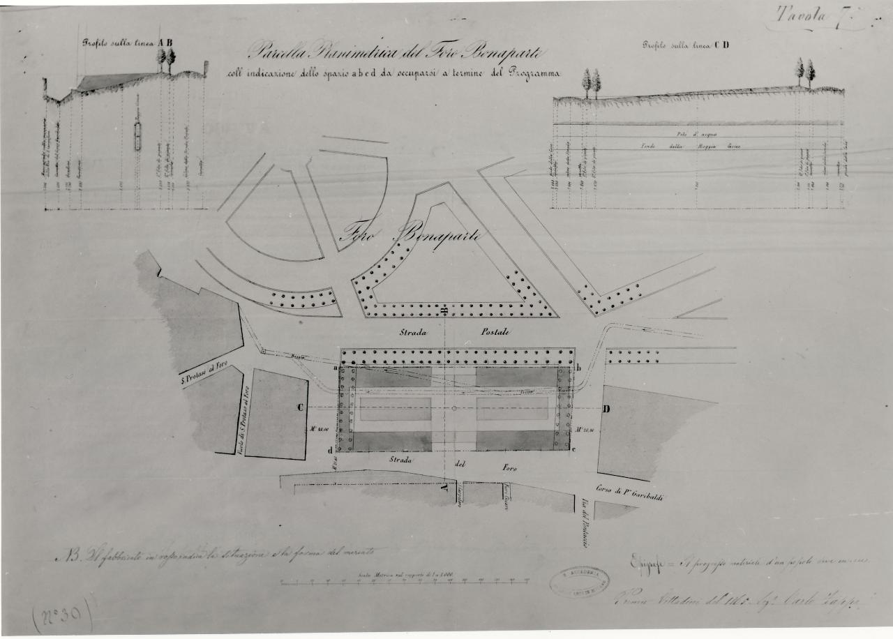 Planimetria a stampa un'area urbana milanese compresa tra Foro Bonaparte (sup.) e corso Garibaldi (inf.), con isolati campiti a tratteggio, indicazione delle strade, linee di sezione e lettere di riferimento. Edificio da realizzare campito in acquerello rosa (rosa chiaro corpi interni, rosa scuro corpi esterni). Edificio rettangolare simmetrico, corte rett. interna nella quale vi sono due corpi rettangolari. Indicazione nuova rete viaria, piantumazioni e rete idrica. In alto a ds. sezione trasversale del terrenocon indicazione di pendenze e posizione della roggia. In alto a sn sez. longitudinale del terreno.