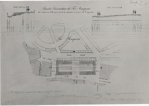 Mercato per i grani e le castagne, con tettoia per mercato delle erbe, a servizio del circondiario di Porta Garibaldi, da erigersi nello spazio fra il mercato vecchio e il largo S. Protaso al Foro. architettura: mercato per grani e castagne per P.ta Garibaldi a Milano (planimetria generale e sezione)