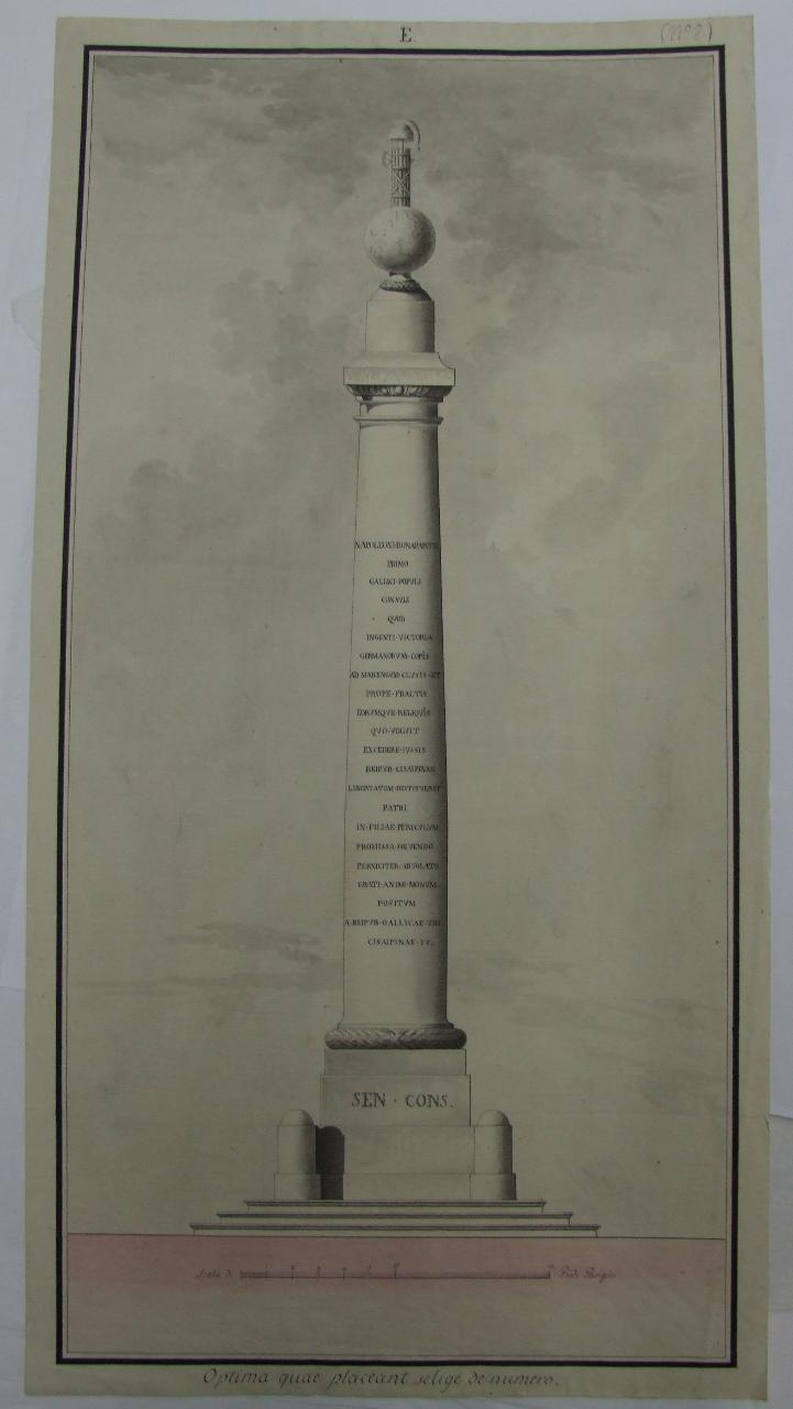 - NOTIZIE STORICO CRITICHE Il disegno è conservato nella cartella 14 che raccoglie altri progetti di colonne trionfali in onore di Napoleone. L'identico motto e la numerazione progressiva fa pensare ad un unico progetto, presentato a Brera durante il periodo della seconda Repubblica Cisalpina.