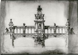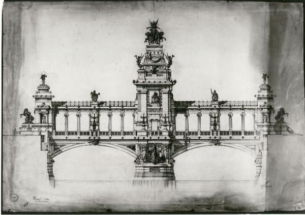 Progetto per ponte commemorativo a matita, su fondo chiaro, con linee di ombreggiatura a tratteggio. Vista del pilone centrale centrale decorato con bassorilievi, statue modanature sormontato da sculture allegoriche che fiancheggiano il gruppo centrale formato da una quadriga. Galleria fiancheggiata da colonne di interpretazione ionica e da balaustra e coperta da volte a botte. Piloni di accesso preceduti da gruppi scultorei.