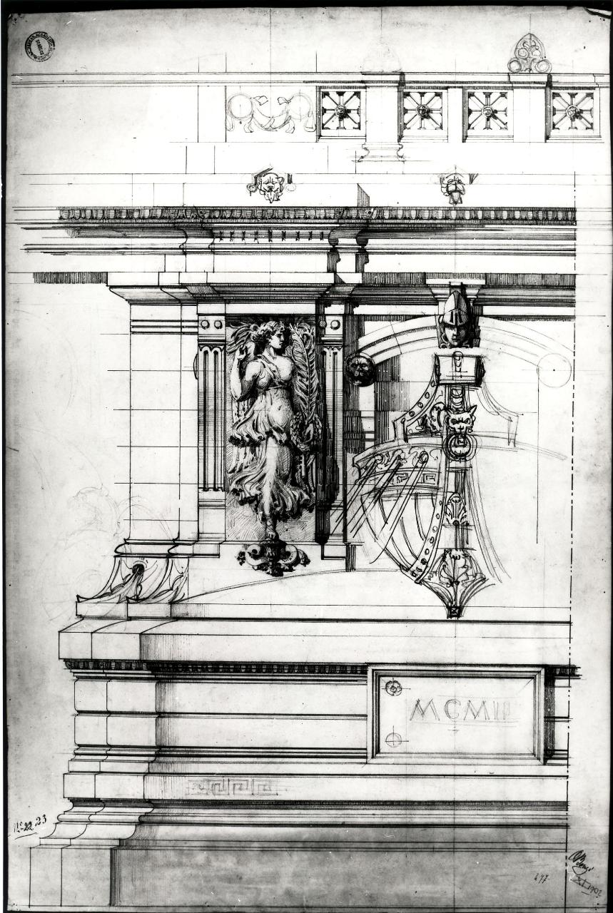 Alzato di parte del pilone a matita con tratteggio su fondo giallo. Prospetto della porzione del pilone all'imposta degli archi con ricca decorazione eclettica. Cornici e gole di rif. al classico. Superiormente bassorilievo allegorico di vestale romana affiancata dalla prua di una nave.