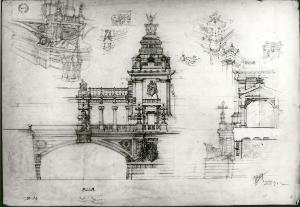 Serie di schizzi a matita di parte di alzato, dettagli prospettici e decorativi su fondo giallo. Al centro schizzo del pilone centrale, sin.: vista prospettica della volta dell'arcata e del pilone; dettagli decorativi. Ds.: schizzi d'angolo con motivi di decorazione eclettica. Spaccato del pilone centrale.