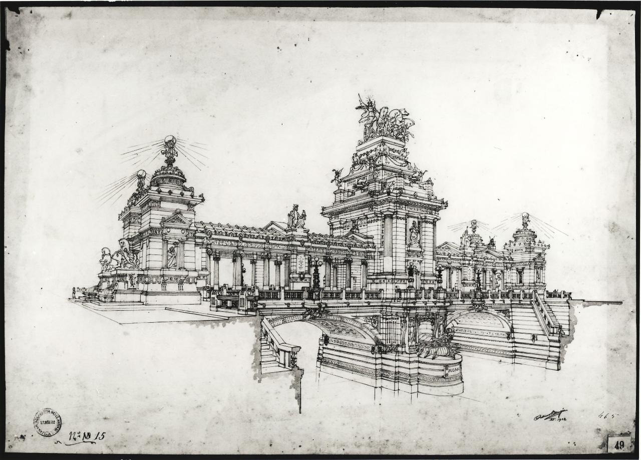 - NOTIZIE STORICO CRITICHE Il disegno è eseguito come prova di sviluppo agli Esami per il conseguimento della licenza di professore di disegno architettonico e al concorso Clerichetti, svoltisi nell'ottobre-novembre 1902. I temi delle prove sono i seguenti. Prima prova estemporanea (27/10/1902): "Stile classico, greco o romano. Ponte in pietra di due arcate aventi ciascuna la luce di metri 30, per tragitto di un fiume con strada coperta della larghezza di metri 12, che immette ai suoi estremi nelle ampie vie che costeggiano il corso d'acqua. La larghezza del fiume misurata tra le faccie [sic] interne verticali dei muraglioni a sponda è 4 metri 75. Il piano stradale negli spazi di accesso alle due testate si eleva di circa metri 16 sul livello normale dell'acqua. La costruzione del ponte commemora un fatto od una personalità insigne: e si vuole concentrata la monumentalità nella parte di mezzo che si eleva sulla pila". Seconda prova estemporanea (29/10/1902): "Stile medioevale. Pulpito isolato in marmo da erigersi in una cattedrale italiana del XIV secolo. Dal pavimento della chiesa alla linea superiore del parapetto del Pulpito non si dovrà superare l'altezza di m. 4,50". Terza prova estemporanea (31/10/1902): "Stile d'oggi. Casa signorile da pigione su area così delineata [area trapezoidale]. Il muro divisorio AB è senza finestre ed alto m. 17. La facciata CD che guarda una piazza e le due risvolte che guardano due vie per m. 15 potranno essere alte fino a m. 18 (quattro piani). Il resto delle parti potranno essere alte m. 14 (tre piani). Il cortile potrà avere uno de' suoi lati aperto verso una via. L'accesso dovrà praticarsi sull'asse di uno dei fianchi. Nel piano terreno rialzato oltre la portineria coll'alloggio del portinajo, al portico ed alle scuderie e rimesse, troverà posto un appartamento. Nel primo piano si distribuiranno due appartamenti; nel secondo e terzo tre appartamenti; nel quarto due". Prova di sviluppo (05-22/11/1902) sul tema della prima prova estemporanea. Bongi ottiene la licenza con 59 punti su 60, e vince il concorso Clerichetti (cfr. ASAB, TEA G III 05, anno 1902)