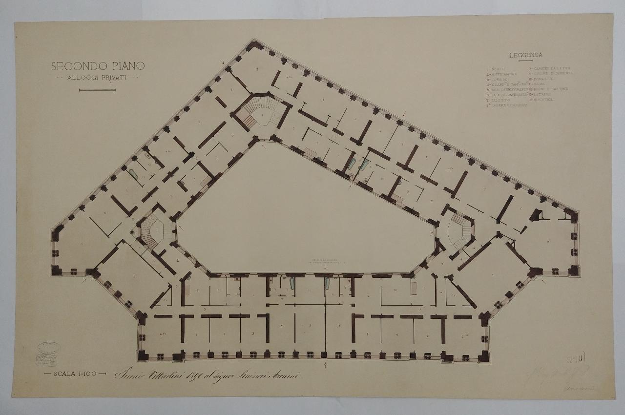 Nuovo palazzo formante il lato di fondo della piazza del Duomo e da costruirsi sull'area disegnata nel tipo annesso al programma. architettura: edificio per piazza Duomo (pianta del II piano)