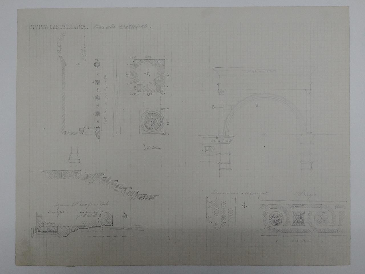 Serie di schizzi quotati a matita su foglio quadrettato chiaro.\nSin.: Sezione dell'imposta e sezione del portico della cattedrale.\nDs.: Alzati della cornice della porta di capitello corinzio e di parte della strombatura del portale.