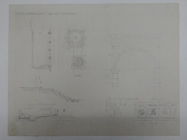 - NOTIZIE STORICO CRITICHE Il disegno appartiene ad una serie di tavole redatte da Monguzzi Giulio come probabile saggio di concorso triennale. Le tavole sono contenute in una cartellina originale recante le seguenti iscrizioni a penna: "Pensione Oggioni", "Saggi dell'anno 1° del pensionato di architettura / di Giulio Monguzzi / da restituirsi al medesimo dietro ordine della Presidenza / di questa R. Accademia", "N. 5 tavole Civita Castellana / N. 9 foglietti Studii diversi / N. 1 1/2 foglietto Studii diversi". La cartellina reca inoltre iscrizione e timbro a inchiostro indicanti: "N° 2347 DELL'INVENT. / DEL SOTTO CONTO N° 4 / CONTO PRINCIPALE" 2". L'architetto ingegnere allievo dell'Accademia, aveva vinto nel 1860 il concorso scolastico per l'esperimento finale della scuola d'architettura con un progetto relativo ad una stazione ferroviaria di terza classe e nel 1863 il concorso Vittadini con un progetto per Bagni Pubblici con annesse scuole di ginnastica e di scherma.
