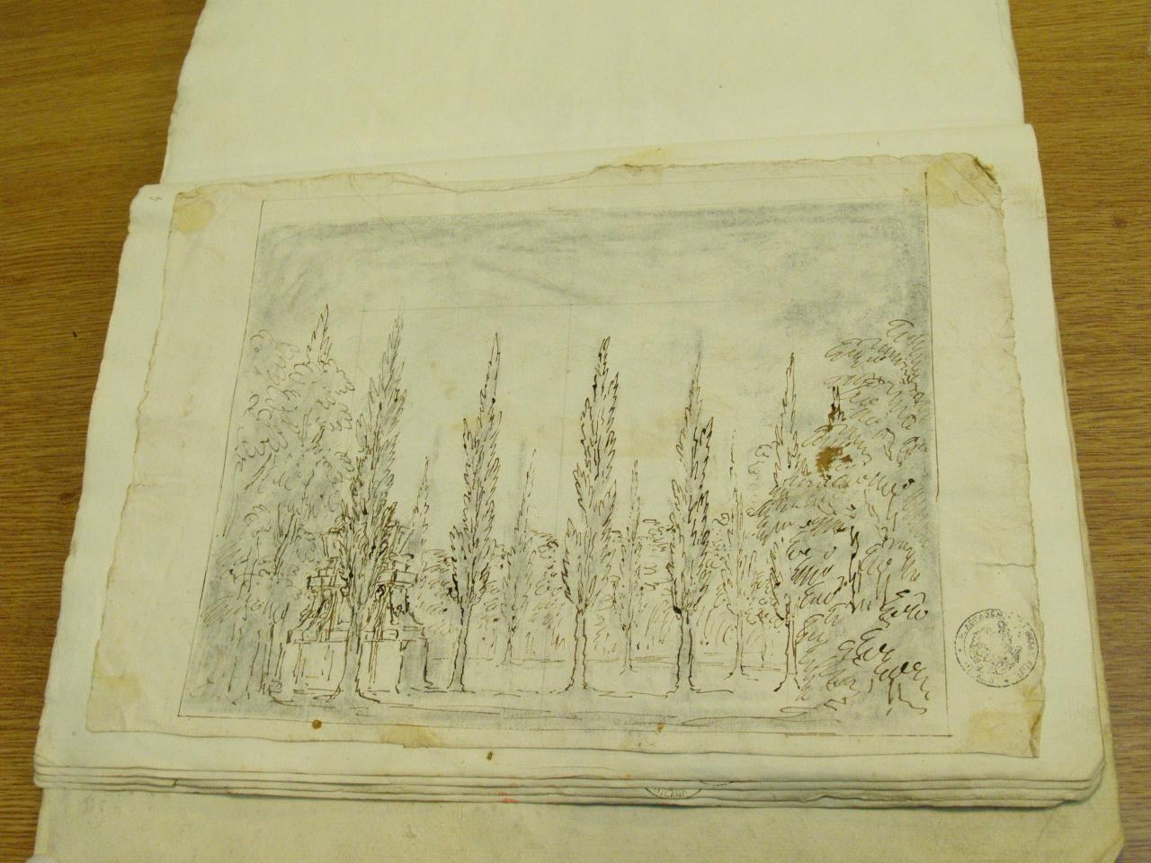 - NOTIZIE STORICO CRITICHE "Molto simile al N. 256, Torino, Museo Civico. [...] E' per le 'Feste di Apollo', Parma, 1769" (Viale Ferrero 1963).\nIl disegno fa parte dell'album "K I 18" recante la scritta "N.9 Rovine Porti di Mare Città esterne Sepolcri e Camere rustiche d'Invenz. di Gio. Galliari in n.o 73". Come per l'album K I 17, questa scritta sembrerebbe successiva ai disegni. Viale Ferrero (1963) precisa che " l'indicazione 'Gio. Galliari' non è esatta; né se si riferisce a Giovanni Antonio perché si trovano molti disegni certo posteriori alla sua morte; né se si riferisce a Giovannino perché molti altri disegni sono datati in anni in cui egli era ancora bambino." Il disegno non è attribuito.Il disegno è simile al DS 3361 e al 3366; tutti, come precisa Viale Ferrero, ricordano il n. 256 conservato a Torino, Museo Civico: "per le 'Feste di Apollo', Parma, 1769" (Viale Ferrero 1963).