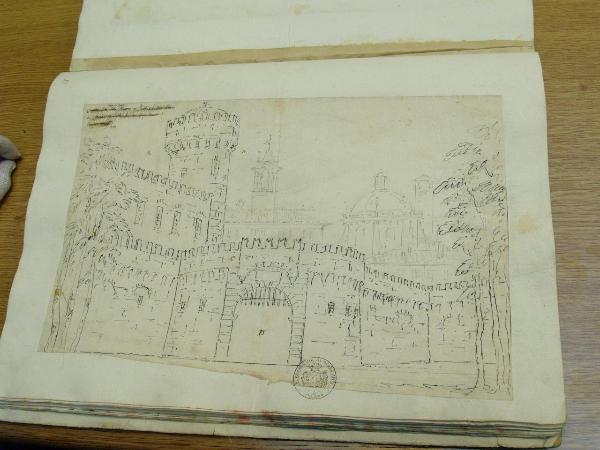 "Vasto sito con Mura e Porta della Cità in facia. 9 della Seconda del Eumene Torino 1759". Mura di città fortificata con porta su torrione semicircolare