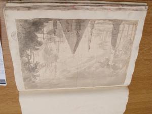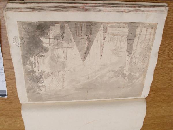 - NOTIZIE STORICO CRITICHE "Una scena simile si trova nella 'Nitocri'. Ma è solo un'ipotesi." (Viale Ferrero 1963)\nIl disegno fa parte dell'album "K I 18" recante la scritta "N.9 Rovine Porti di Mare Città esterne Sepolcri e Camere rustiche d'Invenz. di Gio. Galliari in n.o 73". Come per l'album K I 17, questa scritta sembrerebbe successiva ai disegni. Viale Ferrero (1963) precisa che " l'indicazione 'Gio. Galliari' non è esatta; né se si riferisce a Giovanni Antonio perché si trovano molti disegni certo posteriori alla sua morte; né se si riferisce a Giovannino perché molti altri disegni sono datati in anni in cui egli era ancora bambino. Disegno non identificato. Viale Ferrero (1963) avanza come ipotesi che possa essere per 'Nitocri'. Una edizione dell'opera con scena dei Galliari si ebbe a Torino nel Carnevale del 1752 (libretto del 1751).