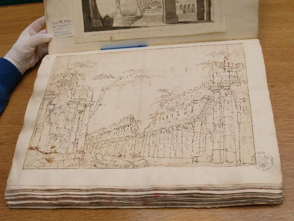 - NOTIZIE STORICO CRITICHE "Il I disegno è bello ed è simile ai disegni per l' 'Eumene' e il 'Nitteti'. La datazione può quindi essere: 1755-1760." (Viale Ferrero 1963)\nIl disegno fa parte dell'album "K I 18" recante la scritta "N.9 Rovine Porti di Mare Città esterne Sepolcri e Camere rustiche d'Invenz. di Gio. Galliari in n.o 73". Come per l'album K I 17, questa scritta sembrerebbe successiva ai disegni. Viale Ferrero (1963) precisa che " l'indicazione 'Gio. Galliari' non è esatta; né se si riferisce a Giovanni Antonio perché si trovano molti disegni certo posteriori alla sua morte; né se si riferisce a Giovannino perché molti altri disegni sono datati in anni in cui egli era ancora bambino. Il disegno non è identificato. Presente una sottile quadrettatura.