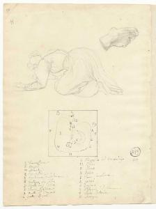Donna chinata a terra e mani. Fgura femminile e mano | Pianta con legenda