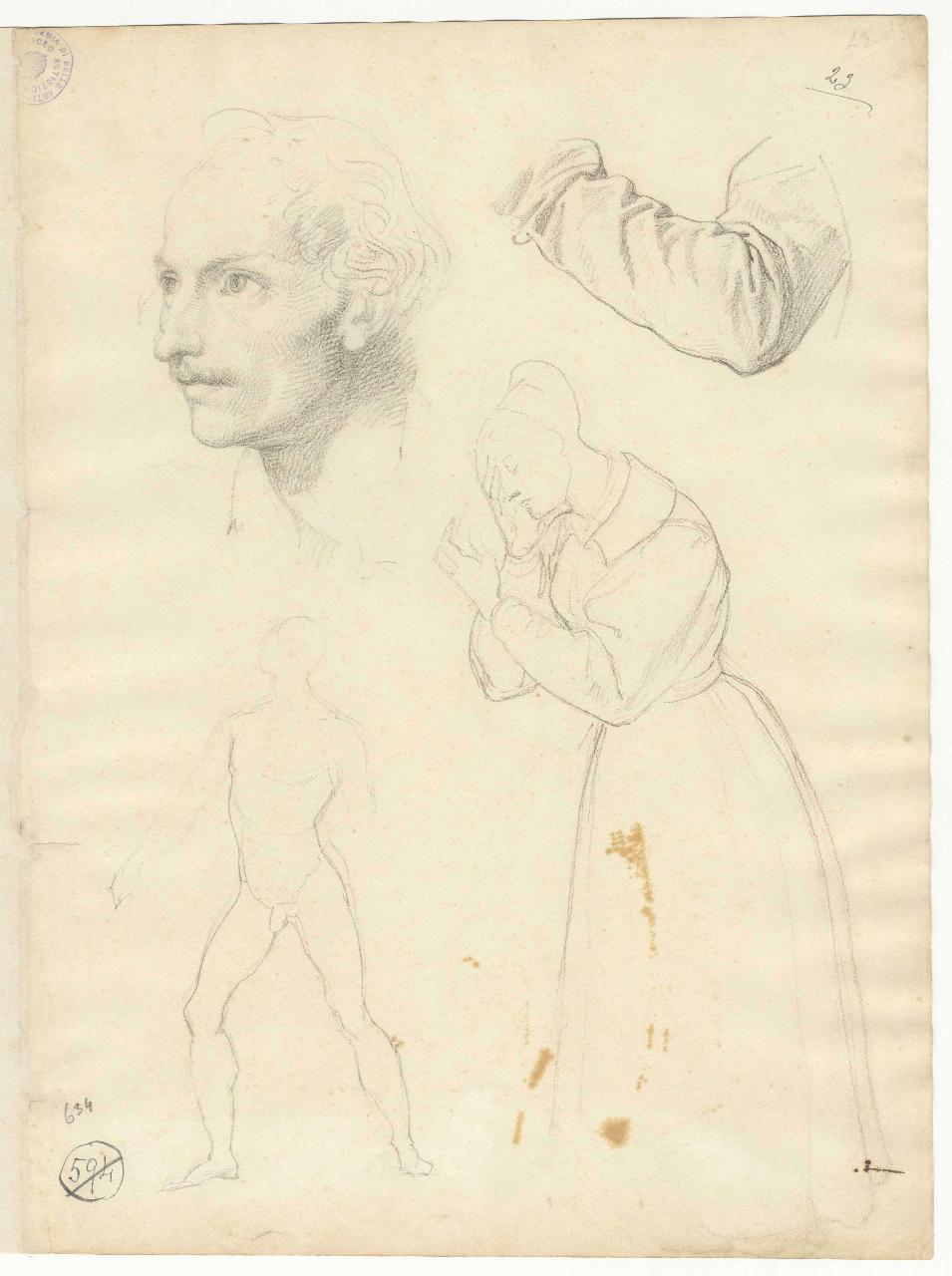 Schizzi vari (figura femminile, braccia, nudo virile e testina dal vero). figure femminili, figure maschili, viso e braccio