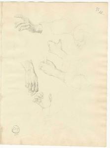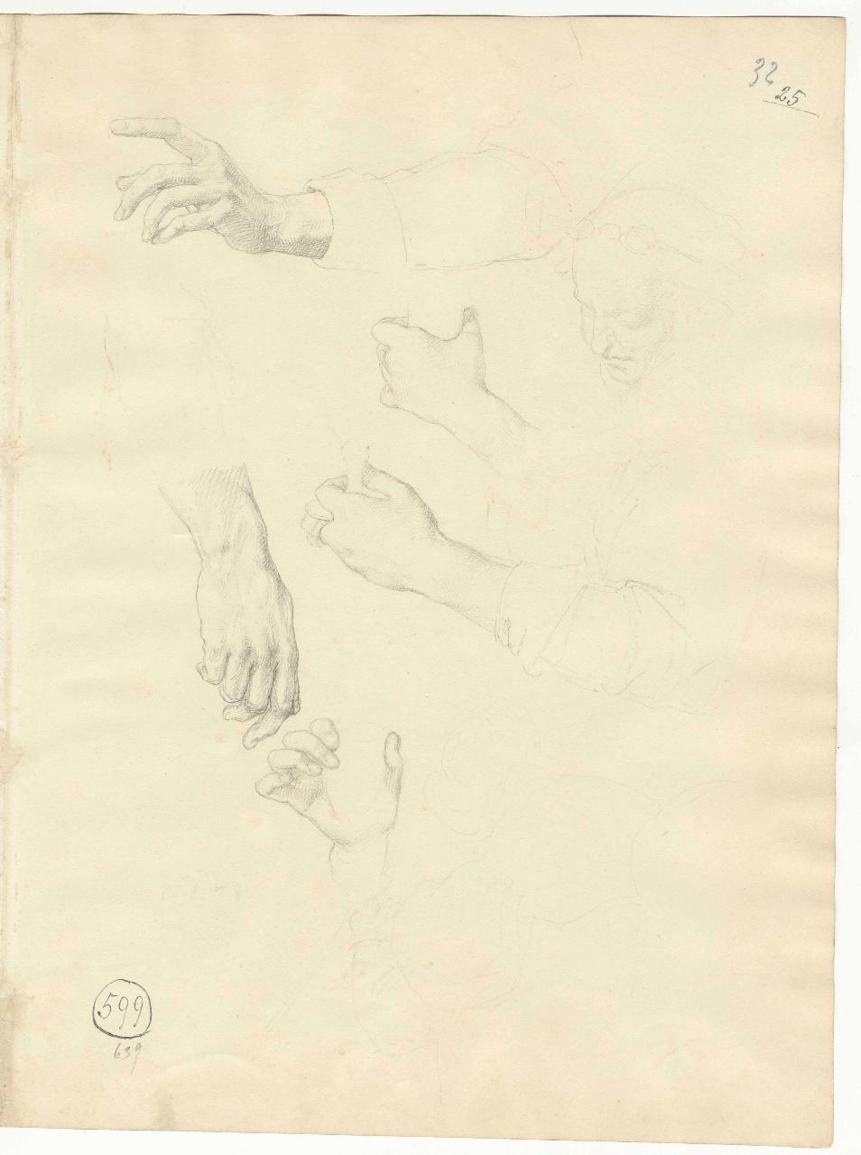 Studio di braccia, mani, testina di vecchia con occhiali. mani, braccia e testa femminile