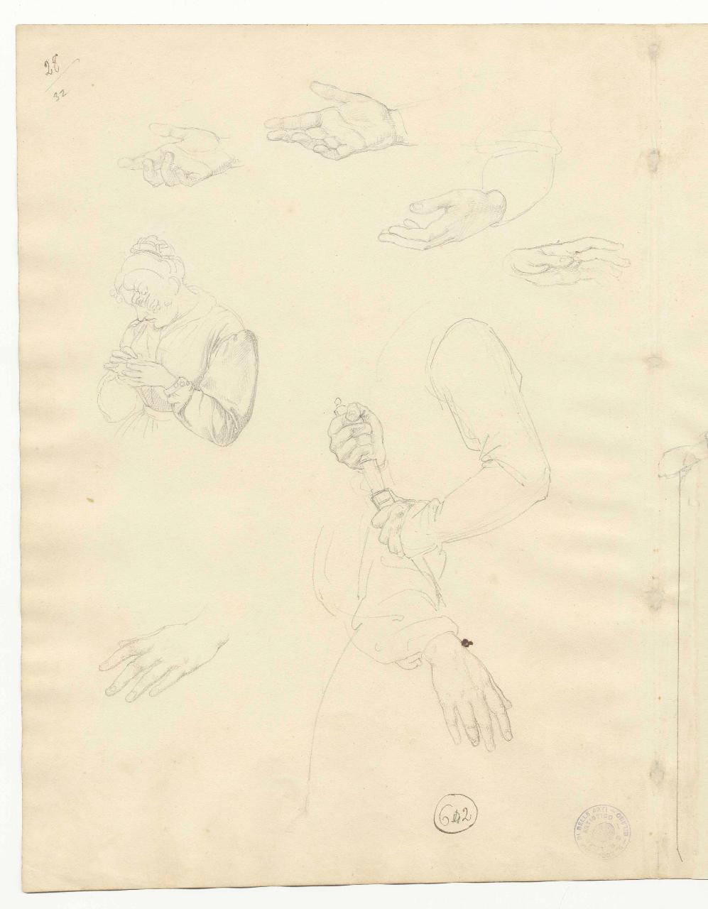 Studi di mezza figura femminile, mani e studio di mano in atto di estrarre un'arma da fodero. mani, viso, panneggio