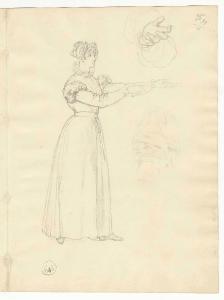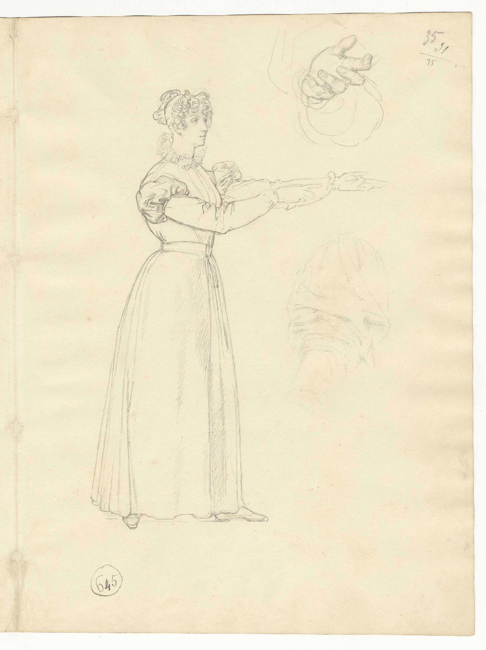Ritratto di donna all'impiedi, panneggio e mani. figure femminili, mano, panneggio