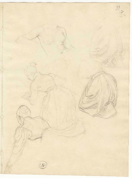 Torso femminile, panneggi e figure inginocchiate. figura femminile, nudo femminile e panneggio
