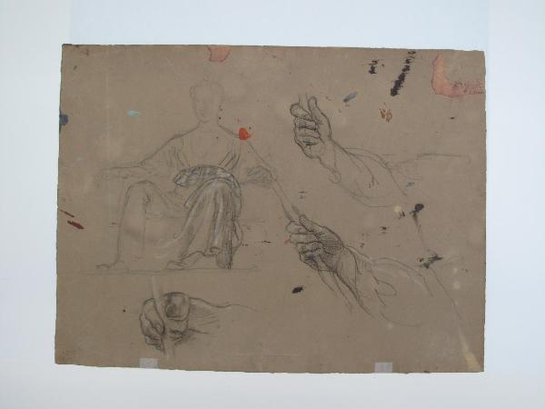 Studi di mani che impugnano uno scettro e figura di donna seduta. figura femminile e mani