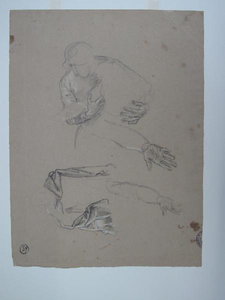 Studi di panneggio, mezza figura (porta-anfora) e braccia. Panneggio, figura e braccia
