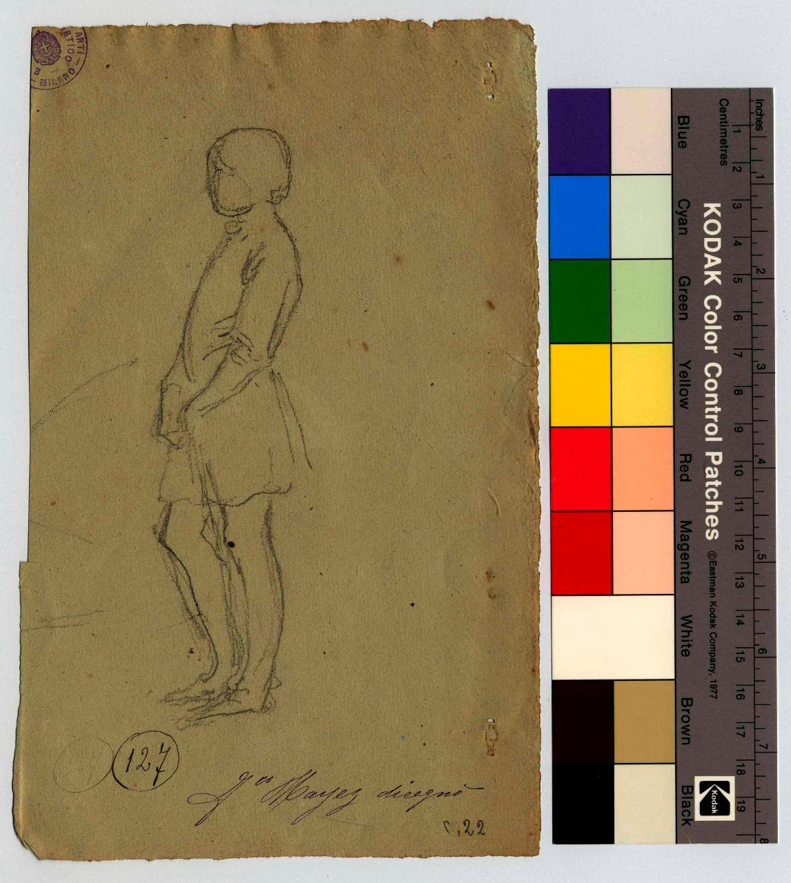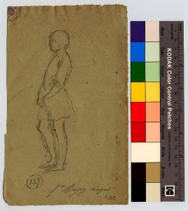 Schizzo di bambino all'impiedi/ Donna seduta a schiena scoperta, vista di tergo. bambino | figura femminile
