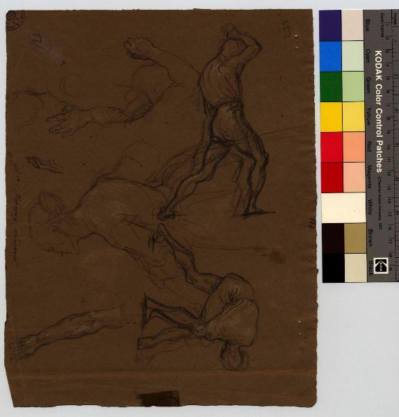 Donna all'impiedi di profilo. Uomo chinato che raccoglie qualcosa per terra. Lottatore. Studi vari di mani, braccia/ Schizzi di uomini in atto di correre. figure maschili e femminili, braccia, mani | figure maschili