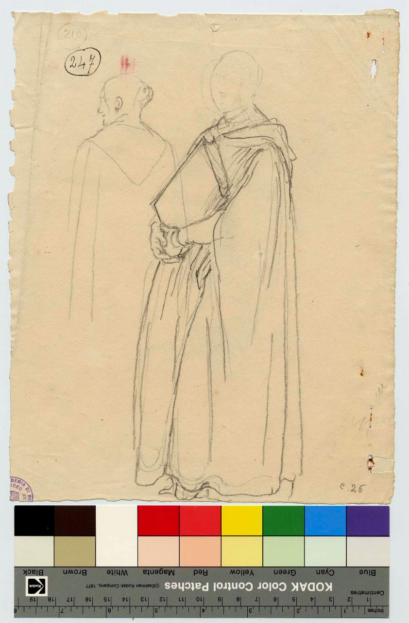 Figura all'impiedi con mantello/ Donna all'impiedi con braccio levato. figura maschile | figura femminile