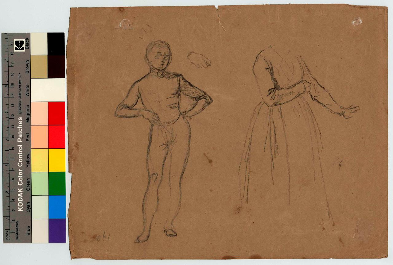 Giovane in costume quattrocentesco e donna acefala. figura maschile e figura femminile acefala