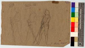 Tre schizzi di cavaliere armato di lunga spada/ Studio di paggio offerente. cavaliere/ paggio