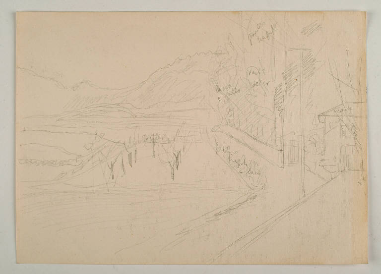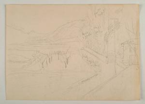 Il disegno, abbozzato nelle sue linee essenziali a matita, è probabilmente uno schizzo descrittivo o preparatorio per un dipinto, in considerazione delle annotazioni sui colori che lo caratterizzano.Vi è rappresentato un paesaggio con un'area piantumata in primo piano e delle montagne sullo sfondo. A destra si scorgono una strada ed una casa, con un giardino alberato cintato da un muro.