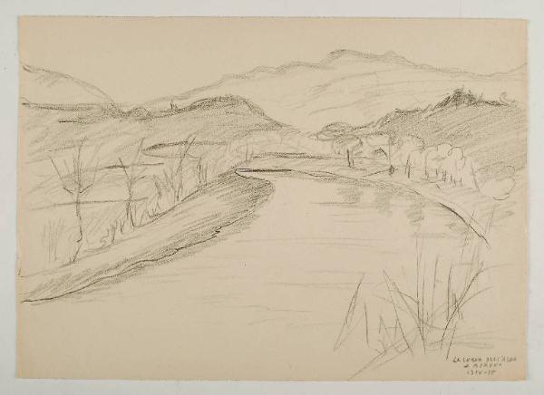 Un'ansa dell'Adda si snoda entro un paesaggio collinare con alberi lungo le sponde del fiume. Il punto di ripresa è collocato sulla sponda destra da dove l'artista disegna con linee granulose a matita una veduta senza presenza umana. Alcuni tratti più neri e sottili delineano con sintetica rapidità la curva del fiume ed i tronchi degli alberi sulla destra. Il punto di ripresa è rialzato e centrale in modo da proporre una visione prospettica del corso d'acqua, con le sponde che progressivamente si restringono.