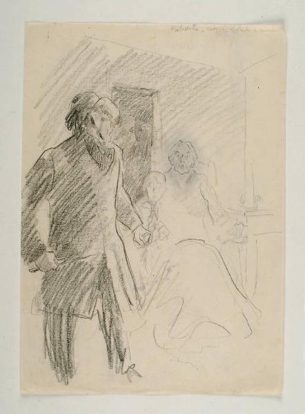 Lo schizzo è un'illustrazione di "Sangue romagnolo" di Edmondo De Amicis.L'autore coglie il momento in cui il bandito Vito Mozzoni, ritratto a sinistra in primo piano, con cappellaccio e pezzuola scura calata, viene riconosciuto dalla nonna di Ferruccio, 'inchiodata sopra un largo seggiolone a bracciuoli'.\nSul suo volto e su quello del nipote si disegnano espressioni di sorpresa mentre, al di là della porta sullo sfondo, s'intravede la sagoma del complice ancora mascherato, avvolta nell'oscurità. L'immagine sottolinea dunque, con funzione didascalica e toni melodrammatici, il momento immediatamente precedente al sacrificio del ragazzo che, lanciandosi sulla nonna, la proteggerà dalla coltellata del malvivente.