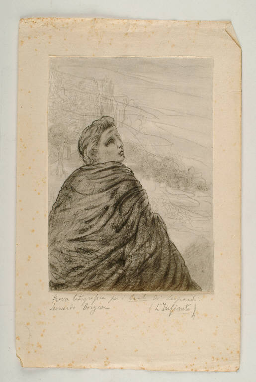 Prova litografica incollata su supporto cartaceo, raffigurante Leopardi, intabarrato in primo piano, sull'ermo colle, secondo l'iconografia romantica del poeta di Recanati. Potrebbe trattarsi dell'illustrazione per un saggio critico dello scrittore napoletano, Leonardo Borgese che fu, fra l'altro. anche pittore ed illustratore.