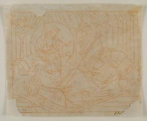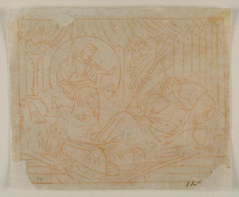 - NOTIZIE STORICO CRITICHE Il disegno è stato interpretato come una raffigurazione di un passo tratto dal canto iniziale della "Gerusalemme Liberata" del Tasso, in cui l' Arcangelo Gabriele appare a Goffredo di Buglione per annunciargli l'invito di Dio a riprendere le guerra, nonostante l'iconografia si discosti molto dalla narrazione, che parla di un Goffredo sveglio (ma anche in altri casi è rappresentato dormiente), che riceve la visita dell'angelo mentre è in preghiera. Nessun particolare elemento contraddistingue la figura sdraiata sul letto, di evidente ispirazione antica, con Goffredo, se non la presenza di un armatura. La figura che appare entro il clipeo non ha ali ed è in abiti femminili. L'identificazione del tema è probabilmente stata effettuata sulla base della diffusione che ebbe nella prima metà dell'Ottocento, sulla scia degli scritti di Chateaubriand.