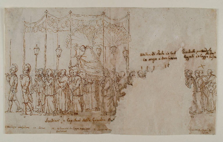 - NOTIZIE STORICO CRITICHE Il Papa raffigurato da Impaccianti è stato riconosciuto come Leone XII°, salito al soglio pontificio nel 1823, il pontefice che celebrò il Giubileo del 1825, altro elemento che può consolidare la tesi di una datazione a quell'anno (CASARIN, 2003, pp. 98-99; vd. anche 0300144706). Era un papa molto popolare, e forse proprio per questo l'accento in questi disegni cade sulla partecipazione di tutte le classi sociali alla cerimonia.
