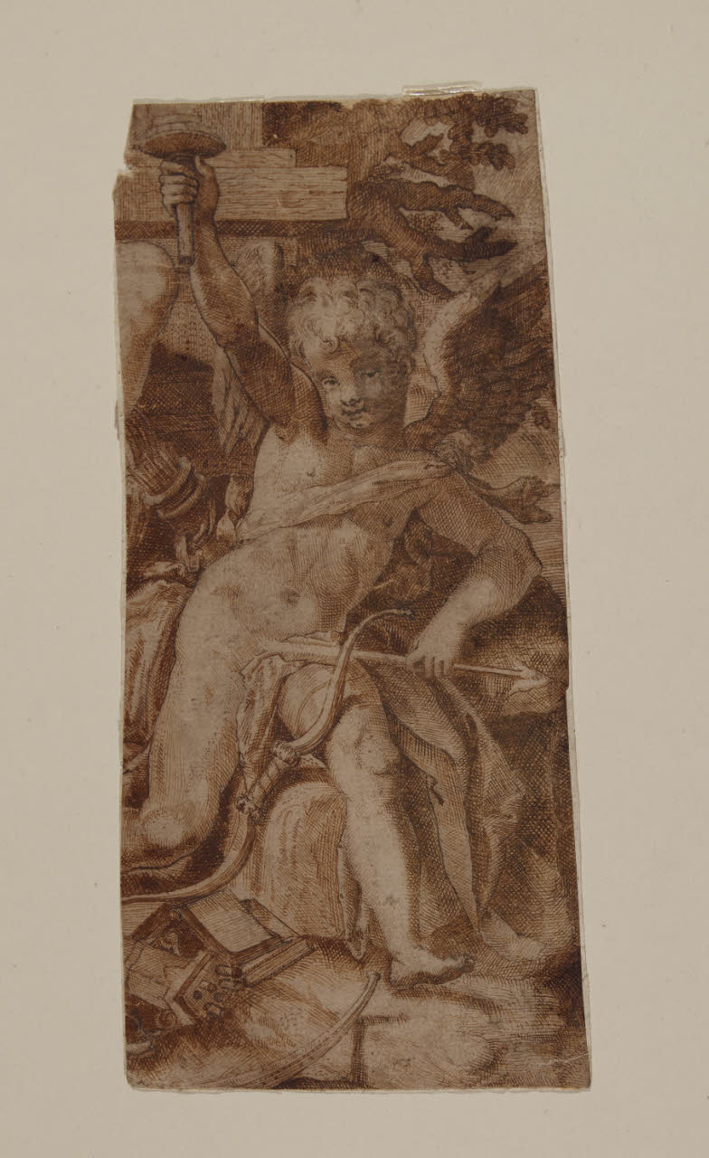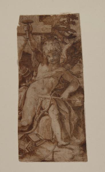 - NOTIZIE STORICO CRITICHE Si tratta di un frammento di copia da un'incisione di Jan I Sadeler su modello di Joos van Winghe, "Bacco, Musica e Cupido", quest'ultima databile tra il 1580 e il 1600. Altri frammenti che possono essere messi in relazione con questo dettaglio sono: Au. A 2016 e Au. B 23.\nNell'inventario storico della collezione ("Inventario Nicodemi"), dattiloscritto, questo foglio era attribuito ad Antonio Allegri detto il Correggio, corretto in seguito, con un'aggiunta a matita, in "(?)".