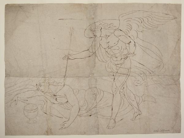 - NOTIZIE STORICO CRITICHE Nel 1792 Appiani fu chiamato dall'arciduca d'Austria Ferdinando d'Asburgo-Este a decorare la Rotonda della Villa Reale di Monza con una serie di soggetti derivati dall'Asino d'oro di Apuleio, e, in particolare, dalle Storie di Psiche. L'artista dipinse le scene all'interno di riquadri rettangolari e di vele triangolari, tra cui Amore desta Psiche, di cui questo grande foglio rappresenta uno studio preparatorio. L'autore ha definito la struttura della scena, prossima all'affresco, scegliendo, mediante l'adozione della pura linea, di non soffermarsi su dettagli minuti o l'impianto luministico. Colpisce l'abilità di Appiani nel trasmettere la plasticità delle figure facendo ricorso a limitati artifici grafici.