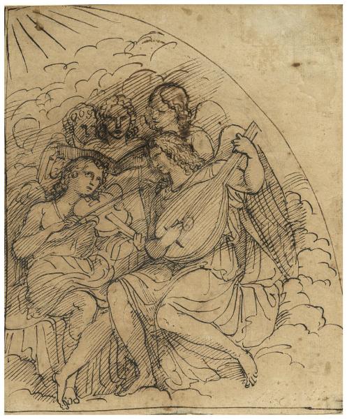 - NOTIZIE STORICO CRITICHE Fra 1791 e 1792, prima di lavorare sulle lunette e sui pennacchi di Santa Maria presso San Celso, Appiani cercò di recuperare alcuni affreschi di Cerano presenti nella chiesa, e ormai deperiti, con degli interventi di ripristino. Nello specifico, affrescò, secondo lo stile dell'artista seicentesco, un puttino e una figura nella prima campata di sinistra e gli angeli musicanti in controfacciata (Leone 2015, p. 45).\nI due disegni (B 50/I e B 50/II) sono studi preparatori per le due lunette della controfacciata. La piccola dimensione dei fogli lascia intuire che si tratti dei primi abbozzi dell'artista, utilizzati per studiare ed elaborare gli affreschi deteriorati. Appiani si impegnò nel replicare con esattezza lo stile dei dipinti murali, studiandone gli effetti luministici e l'equilibrio compositivo. Strettamente connessi ai due fogli, sopravvivono i cartoni che raffigurano l'Angelo musicante con viola, conservato presso la Galleria d'Arte Moderna di Milano (inv. 7036), e gli Angeli musicanti del Civico Gabinetto dei Disegni del Castello Sforzesco (Agg. 771).\nIl timbro presente in basso a destra ha forma e dimensioni simili ai due presenti su un altro disegno di provenienza Attendolo-Bolognini (Au. B 426), essi pure non decifrabili.