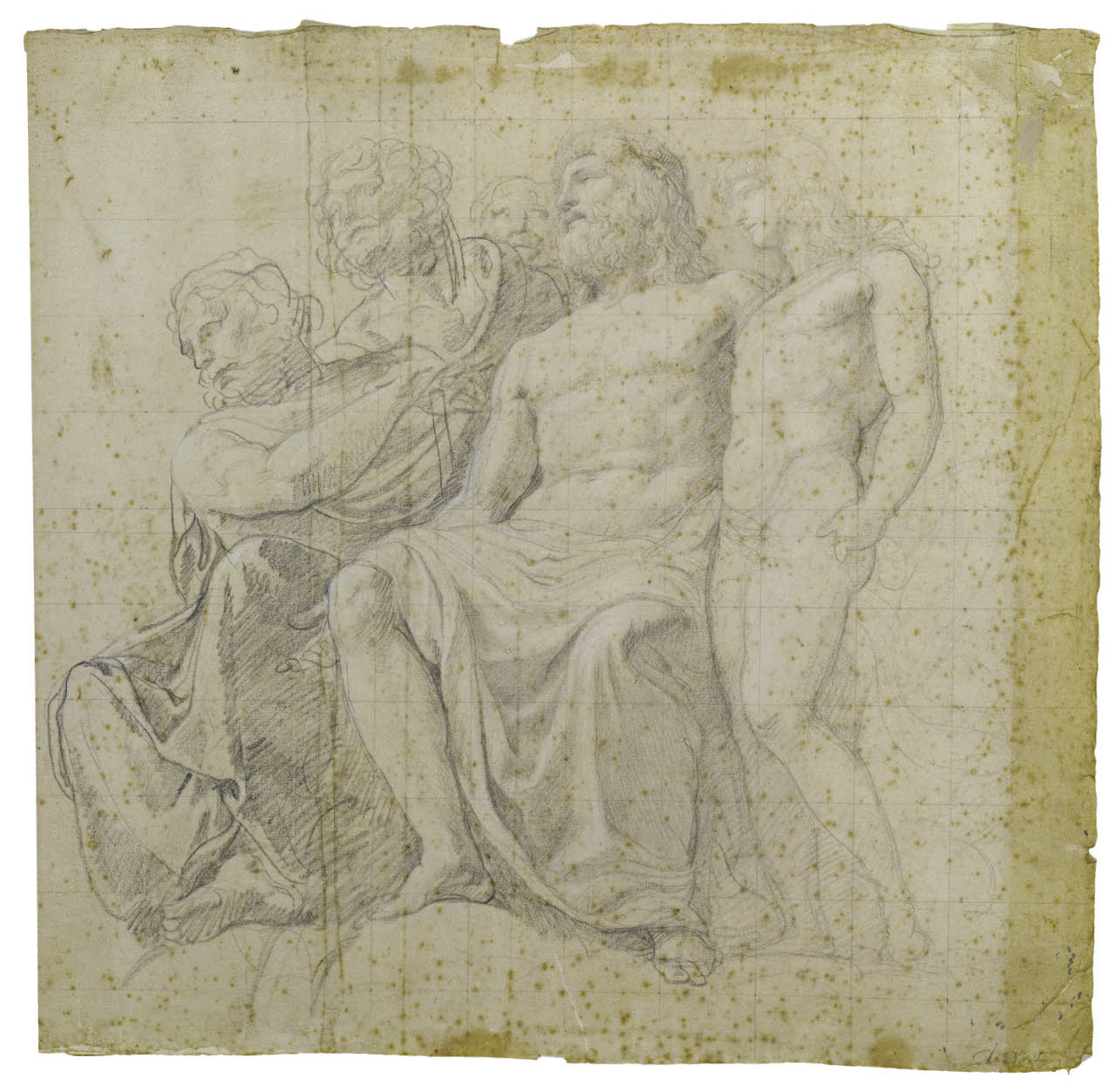 - NOTIZIE STORICO CRITICHE Già associato al ciclo delle Storie di Psiche per la Rotonda della Villa Reale di Monza da Precerutti (1969, pp. 44-45, n. 58), il disegno andrebbe, invece, messo in relazione con la scena di Psiche accompagnata da Mercurio e accolta da Giove nell'Olimpo, dipinta da Appiani nel 1791 in una sala del piano nobile di Palazzo Busca Arconati Visconti a Milano. (F. Leone, Andrea Appiani, pittore di Napoleone, Milano 2015, p.40). Il disegno, di grande bellezza, combina l'analisi dettagliata della figura di Giove e del personaggio alla sua sinistra, con lo studio più approssimativo delle altre divinità maschili. La massa dei corpi si caratterizza per la loro monumentalità e per audaci scorci, insoliti nell'opera di Appiani (Brizio 1975, p. 97, n. 85). La diversa modulazione degli effetti di luce - più contrastati nelle figure a sinistra, più soffusi e morbidi per Giove - fanno pensare che lo studio sia stato preparato durante una fase intermedia della progettazione della decorazione. Dell'affresco esiste anche uno schizzo preparatorio conservato presso la Biblioteca Ambrosiana (cod. F279), probabilmente precedente al disegno del Castello Sforzesco. Sulla scorta di un'iscrizione presente sul verso del foglio - "Peppina Appiani" - è possibile ipotizzare che il disegno appartenesse a Giuseppina, figlia dell'artista.