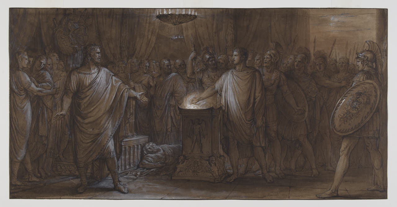 - NOTIZIE STORICO CRITICHE Secondo Francesco Leone (2015, pp. 123-124), i disegni (C 13/2, C 13/3, C 13/5, C 13/6) sarebbero stati presentati al viceré Eugenio di Beauharnais come modelli per l'approvazione della decorazione dipinta nella Sala della Lanterna, un ambiente di Palazzo Reale a Milano. Il cantiere fu l'ultimo a cui lavorò Appiani, che lo abbandonò fra l'estate del 1812 e l'aprile 1813, quando si ritirò dalla scena pubblica a causa di un ictus che lo aveva colpito. Il progetto decorativo era incentrato su soggetti dedicati ai Fasti dei Romani e destinati a otto medaglioni della volta, quadrangolari e ottagonali. Appiani portò a termine solo quattro delle otto scene; degli affreschi eseguiti sopravvivono i cartoni preparatori presso la Pinacoteca Nazionale di Bologna (invv. 7139-7142). Come osserva Marzia Faietti (1999, p. 62), i disegni di Milano non sono semplici schizzi compositivi, ma "sono assai rifiniti e ostentano dettagli decorativi assenti nei cartoni". Gli affreschi godettero di ampia fama, tanto da essere replicati in incisione da Michele Bisi.
