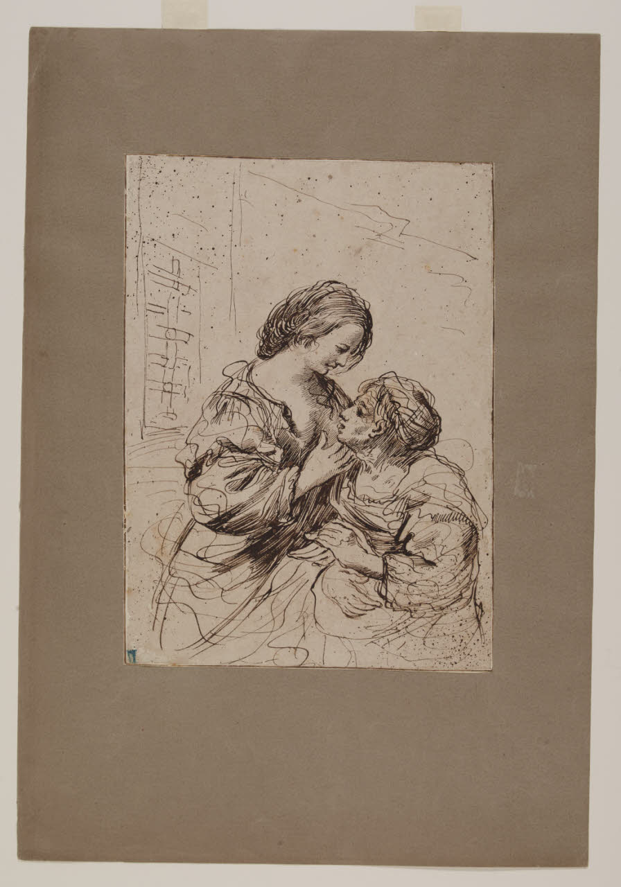 - NOTIZIE STORICO CRITICHE Il foglio è opera del cosiddetto falsario del Guercino, artista attivo tra il il 1760 e il 1800 che ne riuscì a interpretare il tratto grafico, reinventando paesaggi e figure secondo lo stile del maestro. \nIl disegno a penna deriva da un'incisione di Clemente Nicoli, tratta da un'opera a matita del Guercino conservata nella collezione di Pellegrino Gozoli.