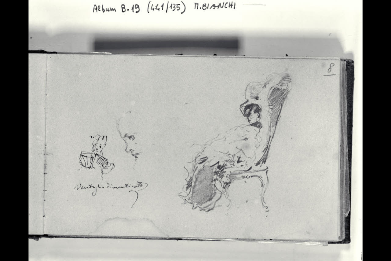 Mezza figuretta, un profilo maschile e una figura probabilmente di chierichetto seduto in poltrona