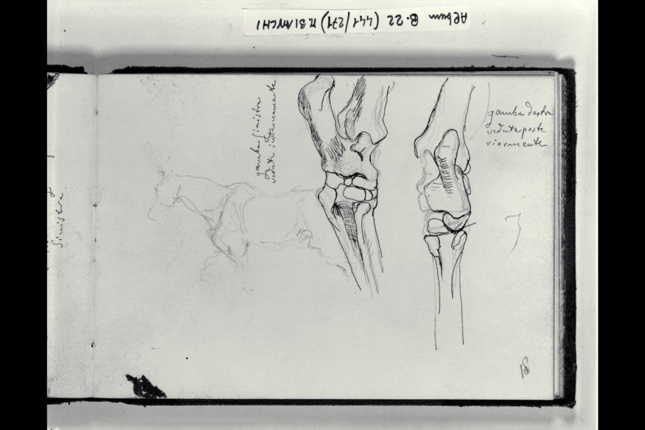 Particolari osteologici di due zampe di cavallo e schizzo di un cavallo al trotto