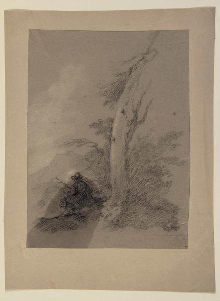 Particolare di paesaggio montuoso con figura di cacciatore ai piedi di un albero spoglio. Particolare di paesaggio montuoso con figura di cacciatore ai piedi di un albero spoglio