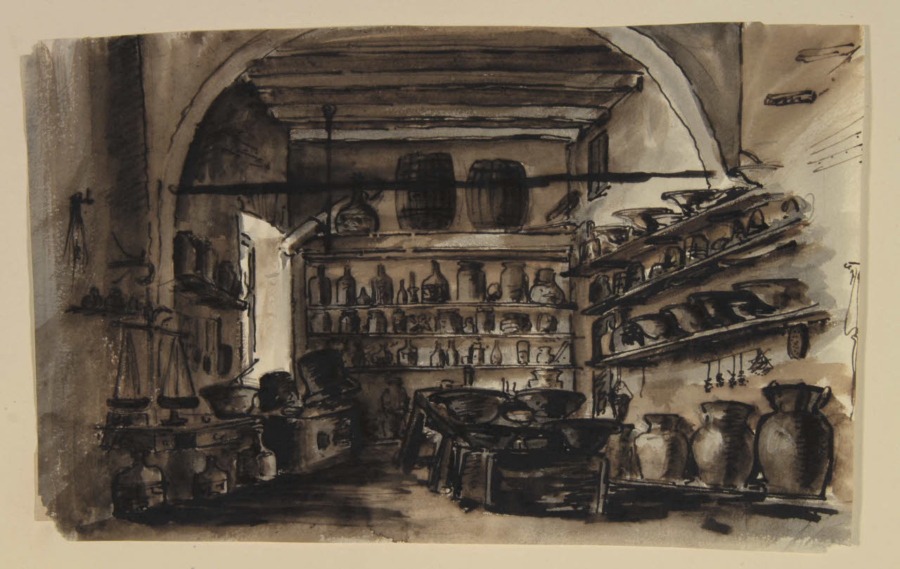Interno di un laboratorio con mensole riempite di vasi, barili e contenitori. Interno di un laboratorio con mensole riempite di vasi, barili e contenitori