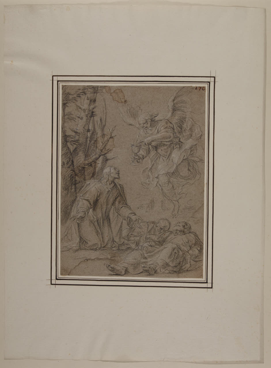 - NOTIZIE STORICO CRITICHE Il disegno fa parte di un nucleo di 34 fogli, alcuni dei quali noti agli studi, tutti realizzati a matita nera e gessetto bianco su carta grigia (eccezion fatta per uno, a matita rossa e gessetto bianco sempre su carta grigia). Tra questi, alcuni recano un'iscrizione attributiva di Giuseppe Bossi e un numero a penna; a livello stilistico (come confermato anche nei casi dei disegni pubblicati), la serie è ascrivibile alla mano del pittore barocco lombardo Antonio Busca. \nIl foglio è stato messo in relazione con le storie della Passione di Cristo per la cappella del Monte degli Ulivi nella chiesa parrocchiale di San Martino ad Altdorf, nel Canton Uri in Svizzera (Bruzzese 2017).\nNell'inventario del 1814 dei beni di Alberico XII Barbiano di Belgioioso (trascritto in M. Forni, "Abitare da principe. Le residenze e le collezioni di Alberico XII Barbiano di Belgiojoso", 2020), nella Cartella G "che contiene i disegni antichi" sono registrati "33 tutti del Busca", stimati £ 66.