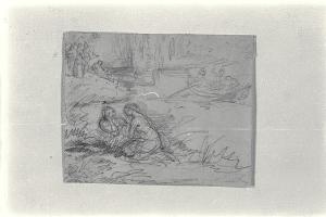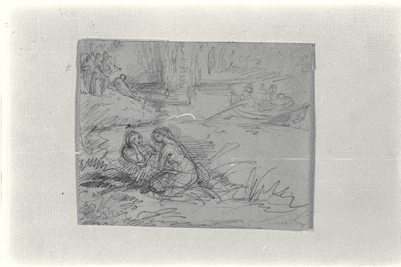 Tratto di fiume con barca e gruppi di figure sulla riva