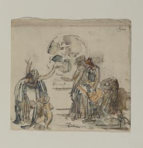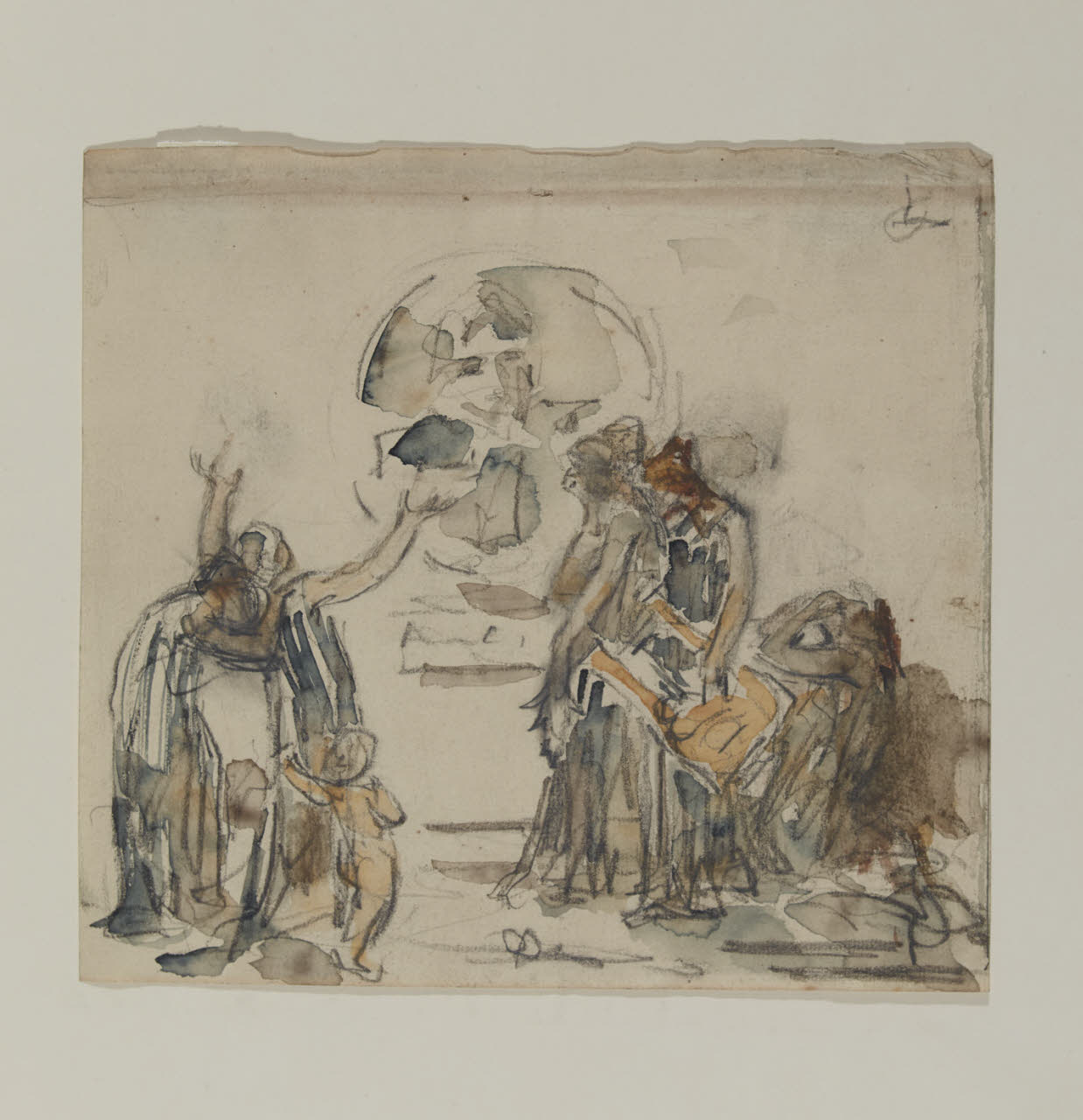 - NOTIZIE STORICO CRITICHE Donato al Comune di Milano nel 1907, questo disegno realizzato e firmato da Luigi Conconi illustra un progetto per un monumento funebre. In primo piano si distinguono infatti due gruppi di figure dolenti in atto di contemplare l'effigie di un defunto posta su un altare: sulla sinistra una donna apre le braccia al cielo, mentre un bambino si appresta a ripararsi al suo fianco. A destra è riconoscibile una donna che tiene una cetra in mano, mentre un'altra pare stringere una fiaccola rivolta verso il basso. Il disegno è eseguito con tratti rapidi e sicuri con la tecnica del carboncino a cui sono aggiunte parti acquarellate nei toni del celeste e dell'ocra, riferimenti questi probabilmente ai materiali costruttivi da impiegare per il monumento funebre.\nIn qualità di architetto, Luigi Conconi progettò e realizzò diversi monumenti funebri nel corso della sua carriera, tra cui si ricorderanno a titolo di esempio quello per Raffaello Barbiera (1895), l'edicola funebre per il fratello Agostino (1889), l'edicola Segre al Cimitero Monumentale (1900), la tomba Muzzi a Corbetta, la tomba del patriota Felice Cavallotti a Dagnente, in collaborazione con l'architetto Luigi Perrone (1898), il progetto per la tomba di Francesco Pozza e quello per Taschini (1915) e l'edicola funeraria Castiglioni a Busto Arsizio (1909) (cfr. R. Giolli, Luigi Conconi: prospetto biografico-critico, con numerosi documenti inediti e ottantacinque illustrazioni intercalate e in tavole fuori testo, Milano 192.., pp. 109-110).