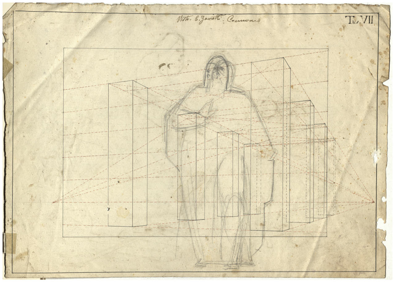 - NOTIZIE STORICO CRITICHE Il foglio mostra una tavola geometrica eseguita con inchiostro nero e rosso. Un abbozzo di figura stante è delineato a matita e deve essere messo in relazione con lo studio della figura di Noé presente sul recto. La tavola riporta il numero VII e in alto si trova una nota manoscritta di avvenuta presa visione da parte di Zanotti del lavoro, eseguito molto probabilmente da Traquillo Cremona durante gli anni dalla sua formazione accademica.