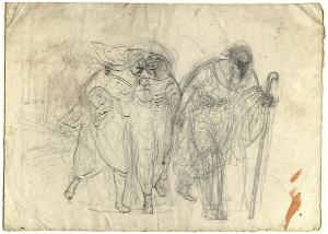 - NOTIZIE STORICO CRITICHE Già appartenuto alla collezione del pittore Luigi Conconi, questo foglio di Tranquillo Cremona rappresenta un abbozzo di scena biblica nella quale si riconoscono due donne con in braccio probabilmente i loro neonati e un vecchio mentre si allontanano insieme da un altro gruppo di figure visibile in secondo piano. La tavola, che non trova alcun riscontro tematico con la produzione pittorica nota di Cremona, venne eseguita dall'artista durante il suo periodo di formazione accademica, come testimonia la nota manoscritta sul verso del foglio.