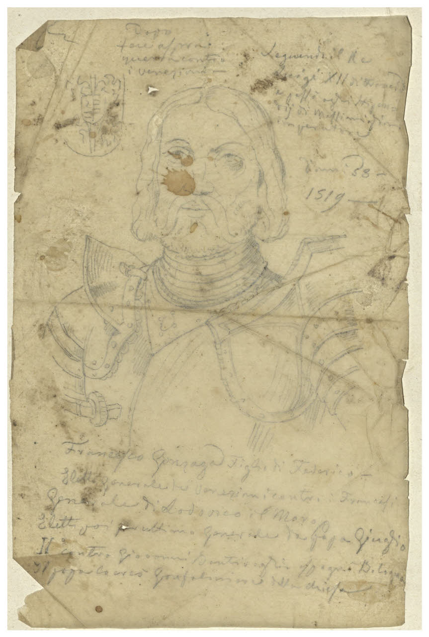 - NOTIZIE STORICO CRITICHE Già appartenuto alla collezione di Luigi Conconi, questo disegno di Tranquillo Cremona raffigura il ritratto a mezzo busto di Francesco II Gonzaga. L'effigie è derivata nello stesso verso dall'illustrazione incisa contenuta ne "Ritratti et elogii di capitani illustri" (p. 180) di Giulio Roscio, volume pubblicato a Roma nel 1635. L'artista appuntò inoltre accanto al ritratto alcune notizie biografiche del personaggio desunte dall'elogio di Roscio. Il modello di questa iconografia risale ad un dipinto attribuito alla bottega di Fermo Guisoni e conservato nel Palazzo Ducale di Mantova. Durante gli anni della sua formazione, ricevuta prima a Venezia e poi a Milano, Cremona si esercitò lungamente attraverso la pratica del disegno: nota è del resto l'abitudine del pittore di portare sempre con sé dei taccuini da disegno nelle sue visite a musei e gallerie (cfr. L. Beltrami, Un maestro Tranquillo Cremona, 1837-1878, Roma 1929). Il foglio in esame fa parte di una serie di uomini illustri immortalati da Cremona a scopo documentario e destinato forse ad un'impresa mai realizzata.
