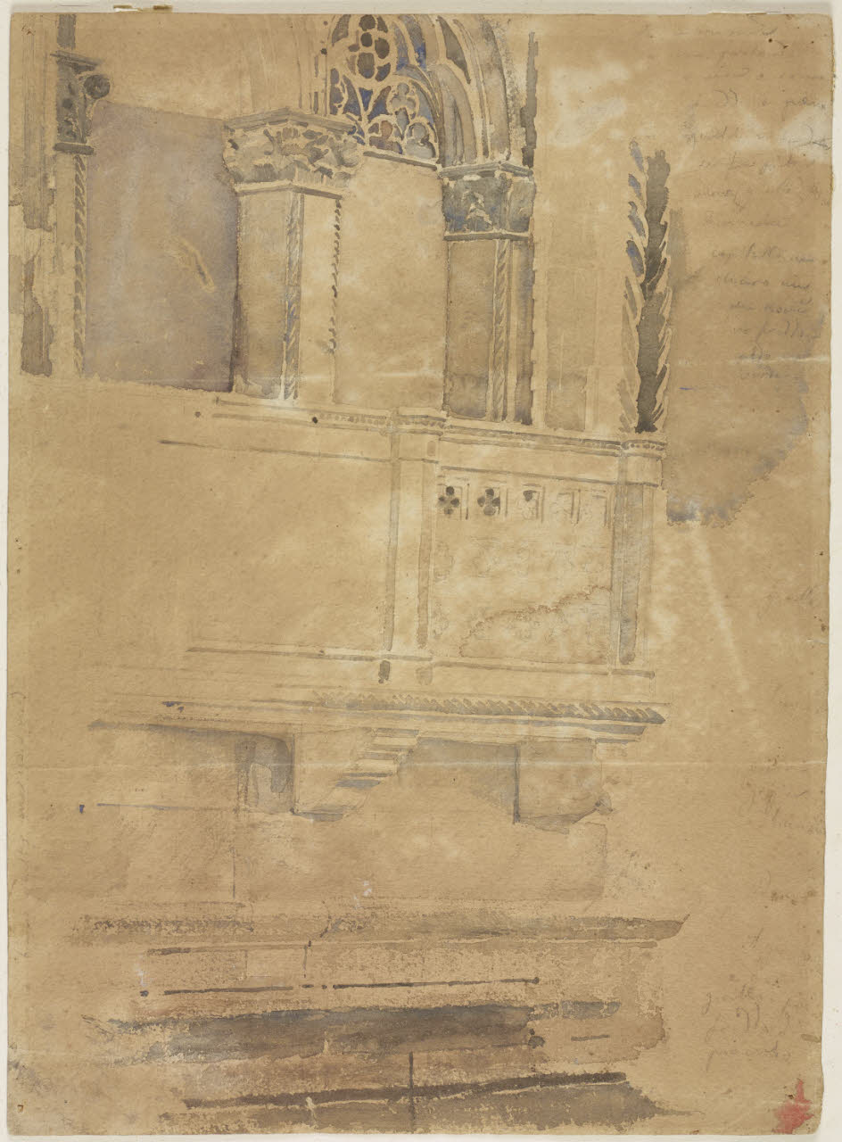 - NOTIZIE STORICO CRITICHE Appartenuto alla collezione del pittore Luigi Conconi, questo disegno di Tranquillo Cremona raffigura sul recto il particolare di un terrazzino coperto, o verone, medievale. Le particolarità dei decori a mosaico lasciano supporre che questo disegno di architettura sia stato realizzato a Venezia. Accanto all'elemento architettonico sono presenti alcune note manoscritte quasi illeggibili con indicazioni di colori. Per tecnica e disposizione del motivo architettonico, questo foglio può essere avvicinato cronologicamente all'acquarello "In sandalo" databile al 1866 circa.